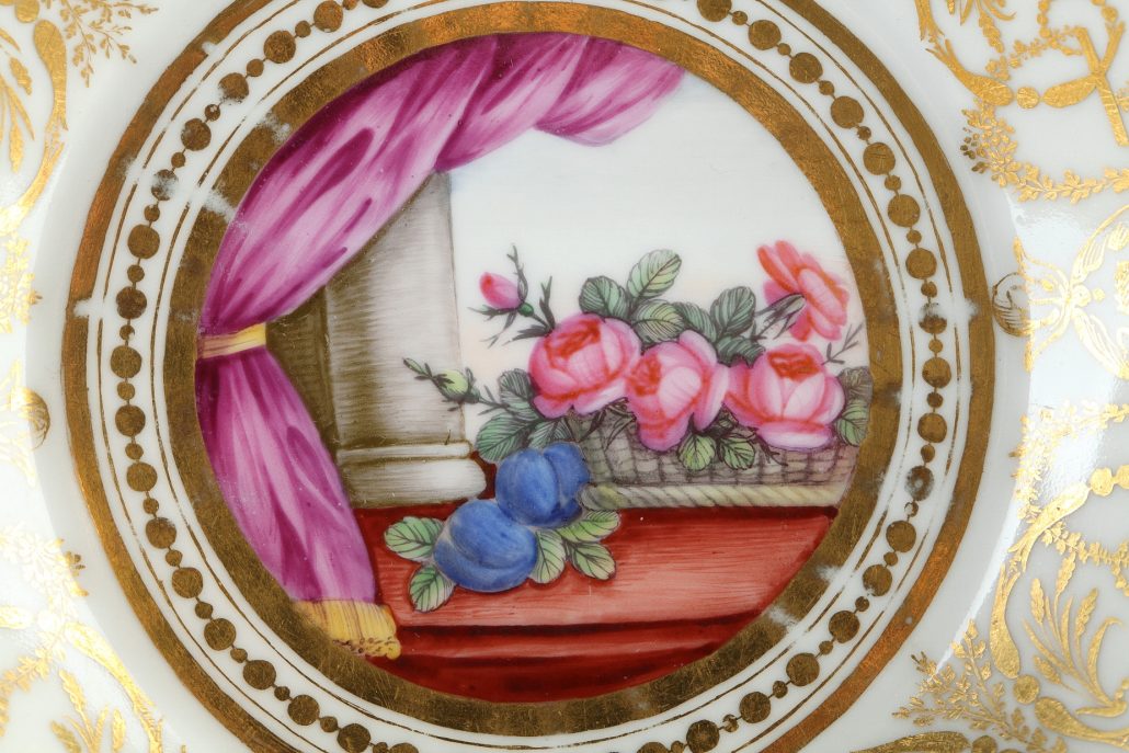 PARIS : Tasse litron et sa soucoupe en porcelaine décorées dans un cartouche d’une nature morte représentant des roses dans un panier près d’une draperie . Encadrement de rinceaux et feuillages dorés.