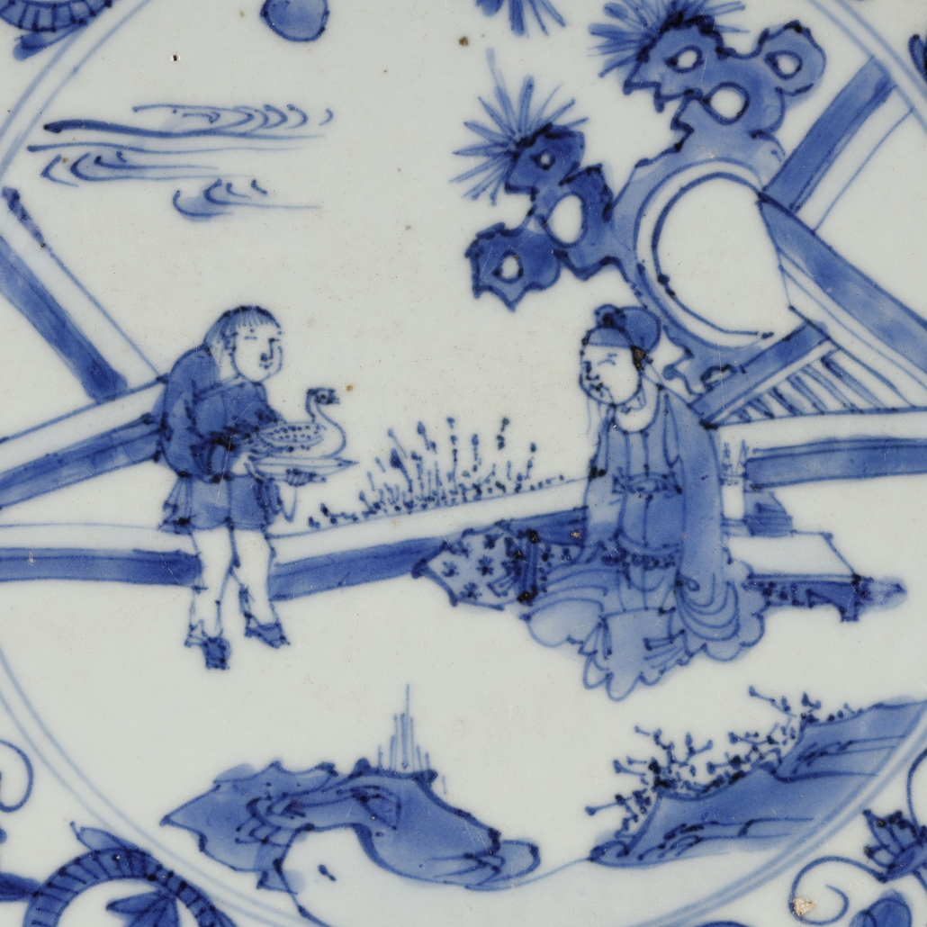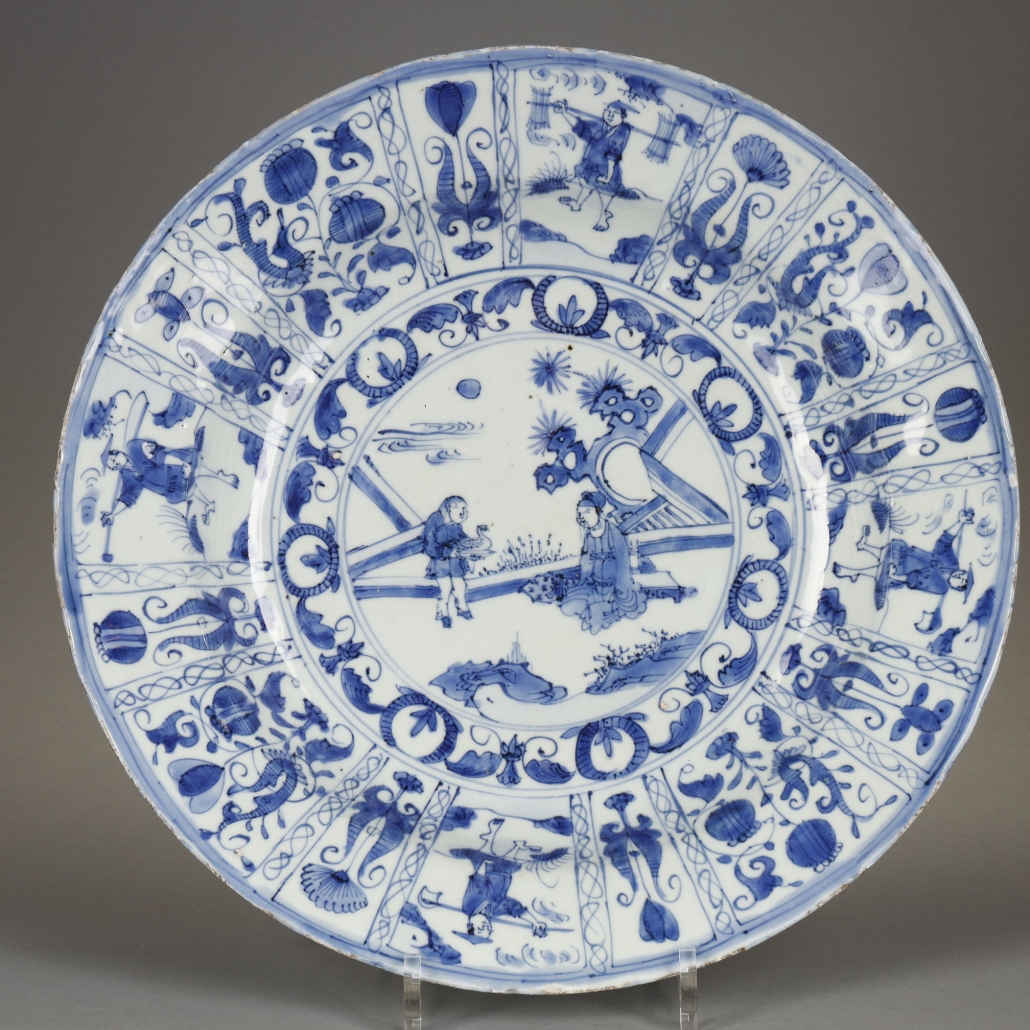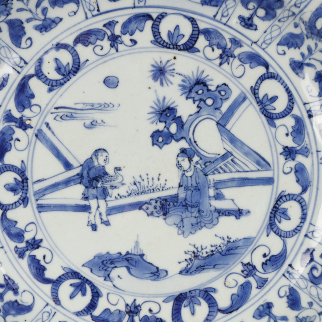 Grand plat en porcelaine KARAK, (KRAAK) décoré en bleu sous couverte dans un large médaillon central d’un rare décor d’un serviteur  présentant un faisan sur un plat à un lettré. Sur l’aile représentation de serviteurs dans des cartouches alternés de tulipes et de motifs floraux.