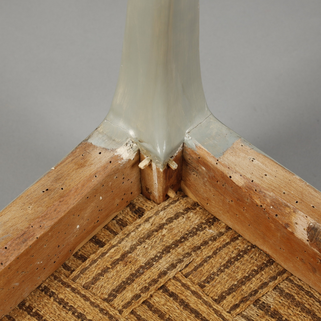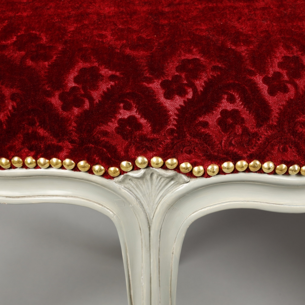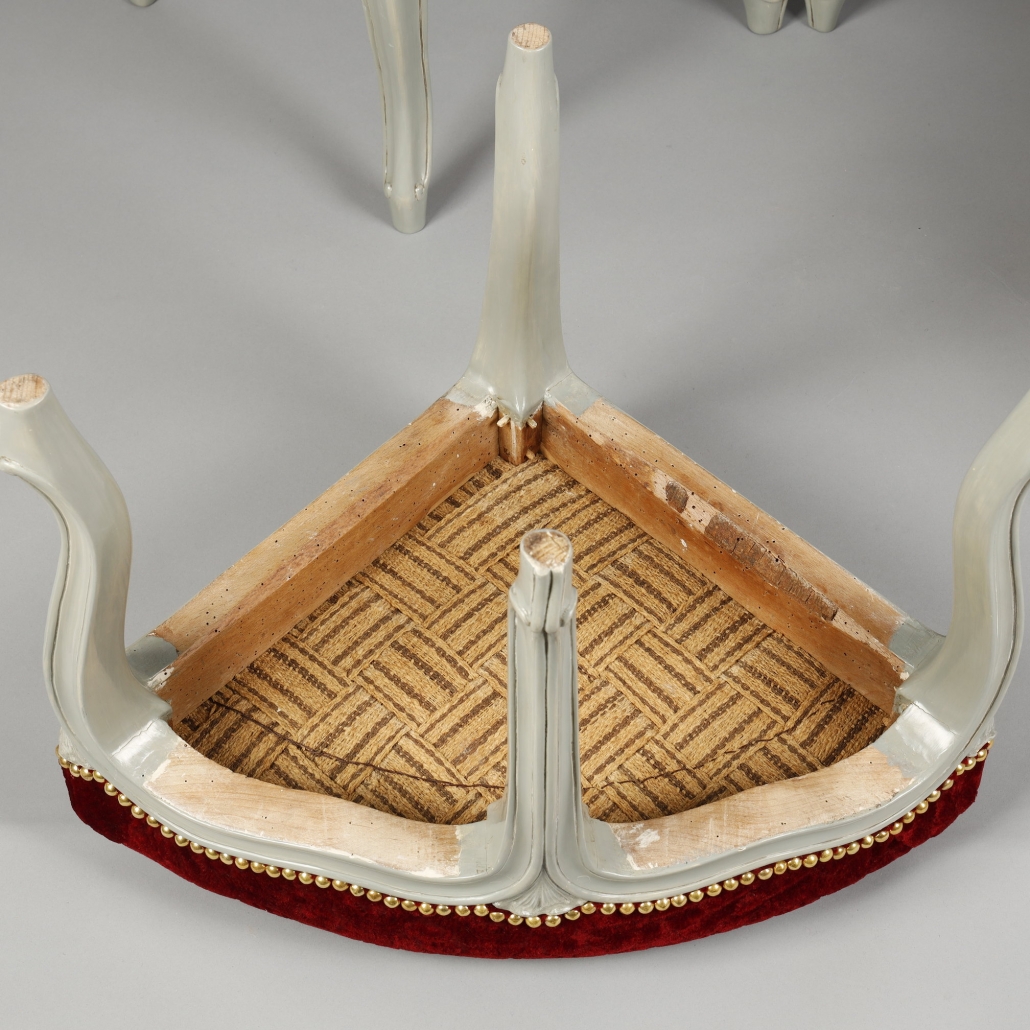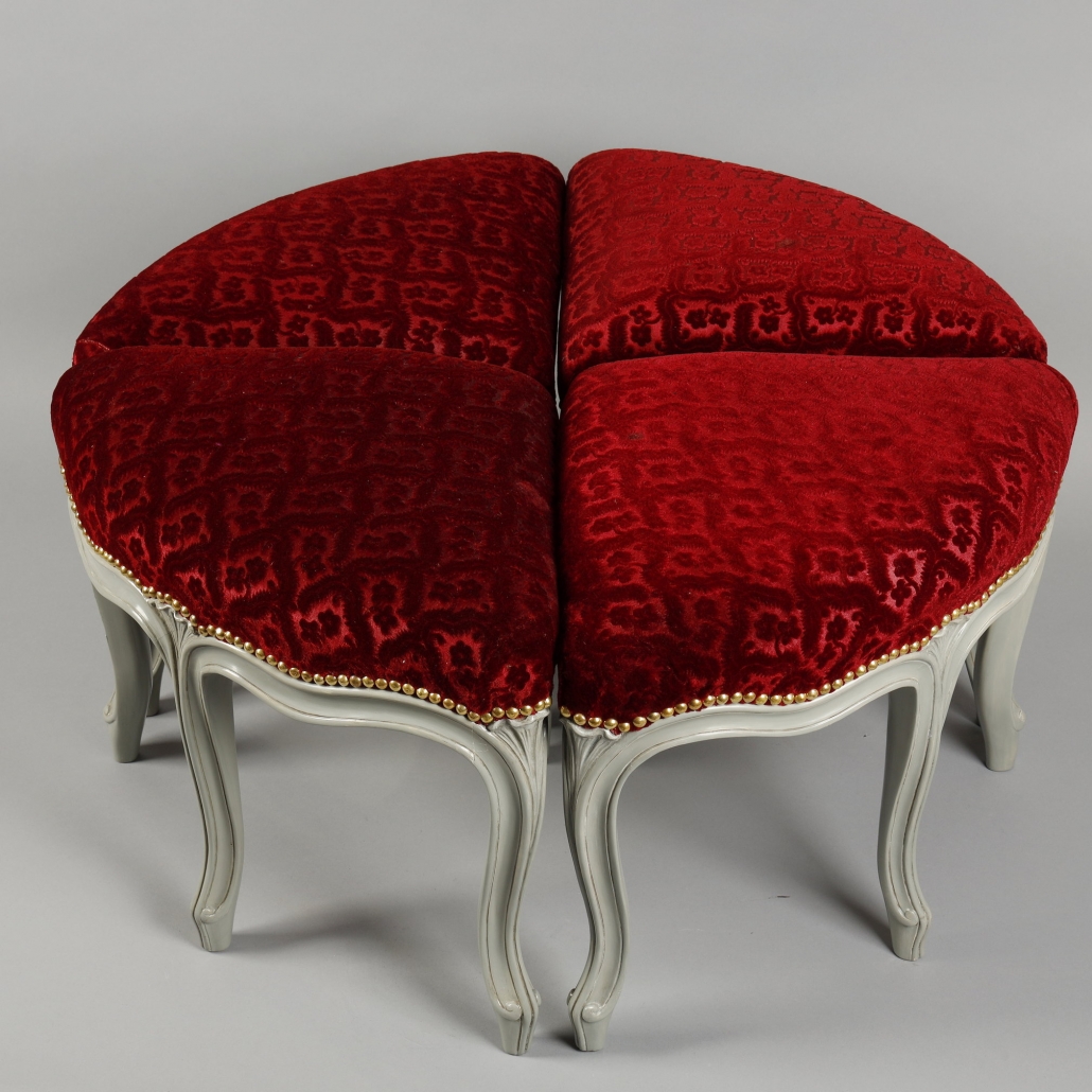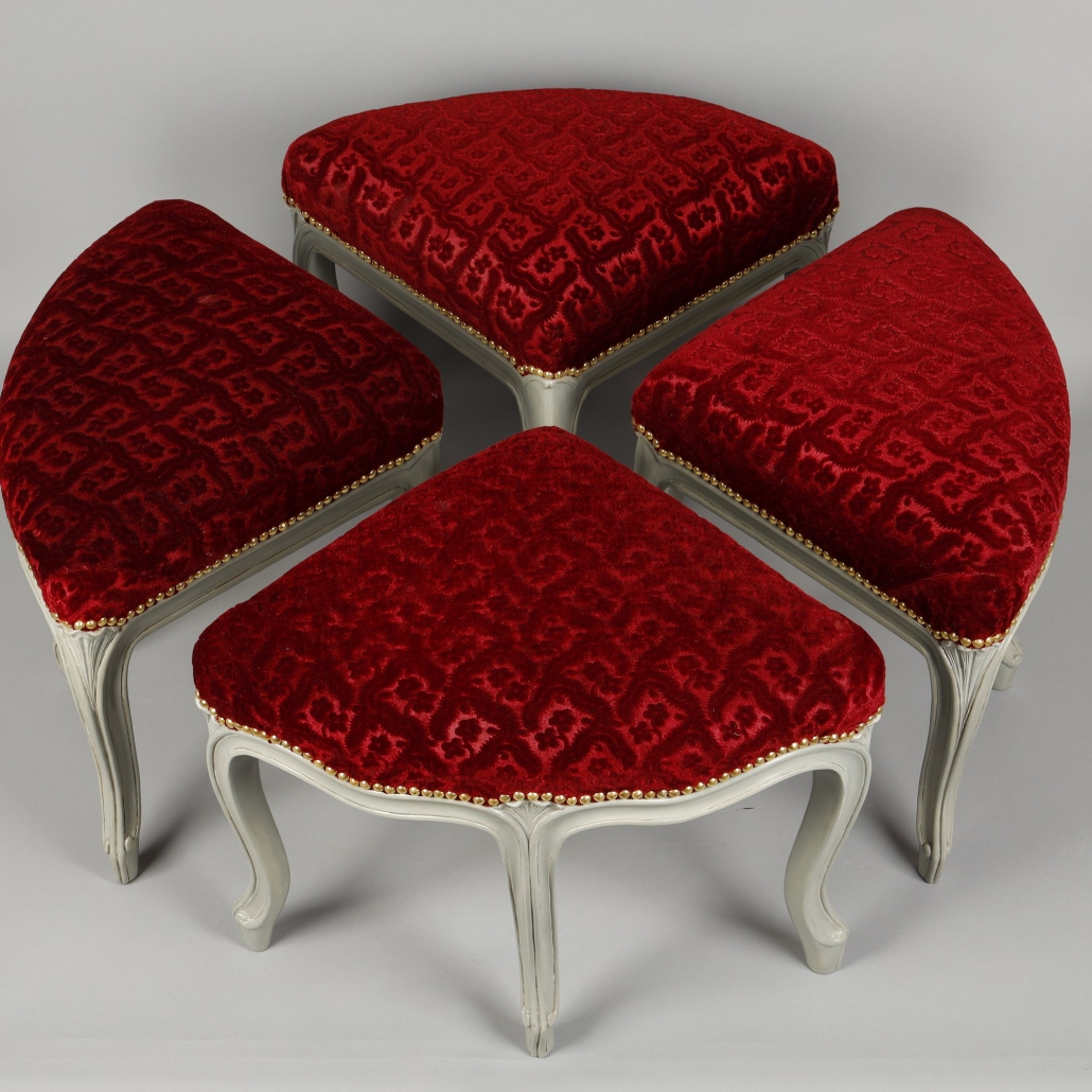Exceptionnelle suite de quatre tabourets d’angle formant “borne circulaire” en hêtre mouluré et sculpté d’un éventail en haut des pieds, remis dans leur premier état de peinture en chipolin gris vert (stil de grain), verni et poli. Belle garniture à sangle de chanvre, recouverte d’un velours de laine cramoisi et gaufré “à la pensée” de l’époque, à clous en bronze fondu poli et dorés à la feuille d’or et au mercure. Estampillés de Philippe POIRIE reçu Maitre Menuisier à Paris en 1765.