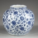 Large pichet en porcelaine de forme balustre décoré en bleu sous couverte dans une réserve centrale d’une femme au parasol avec sa servante et un petit chien encadrées d’oiseaux et de paysage de montagne avec pagode dans deux autres cartouches.