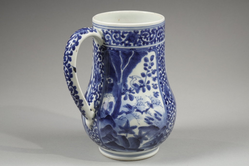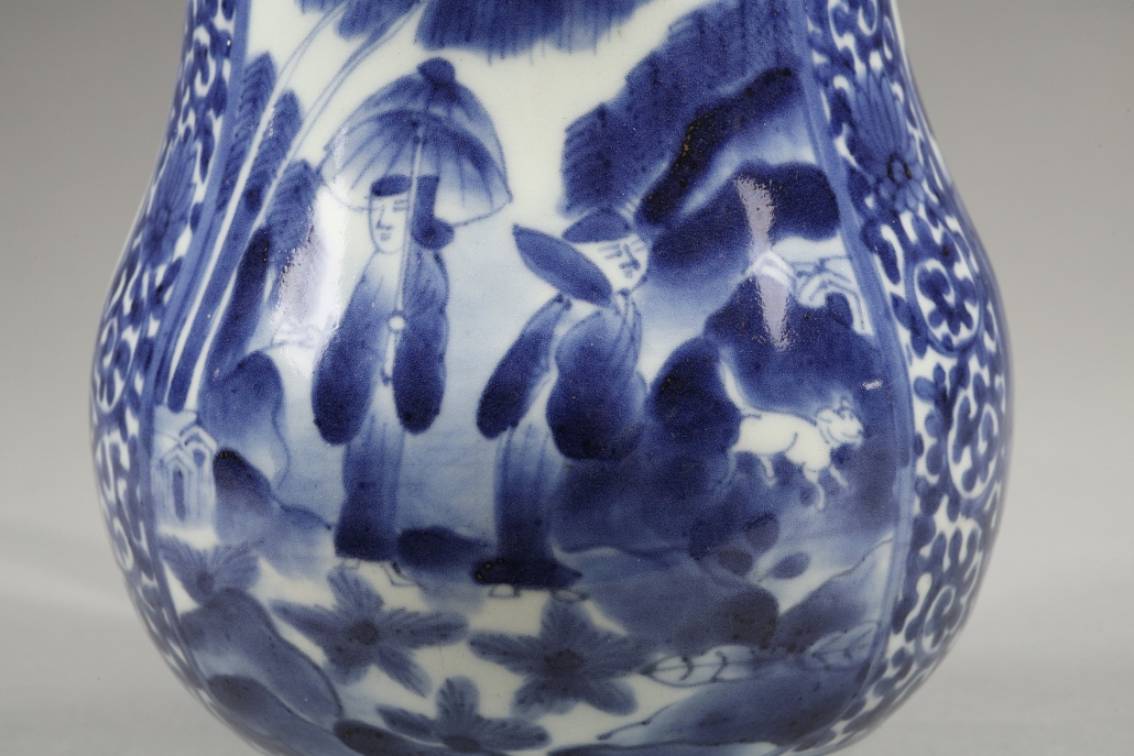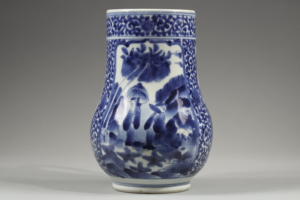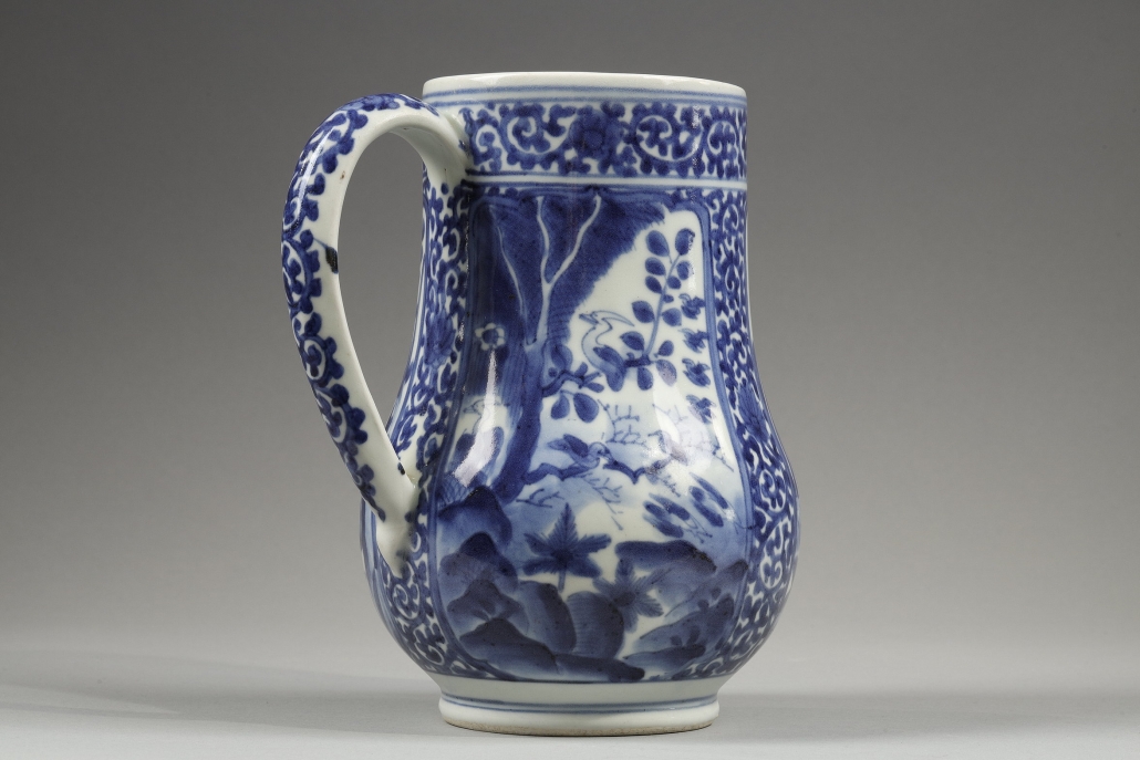 Large pichet en porcelaine de forme balustre décoré en bleu sous couverte dans une réserve centrale d’une femme au parasol avec sa servante et un petit chien encadrées d’oiseaux et de paysage de montagne avec pagode dans deux autres cartouches.
