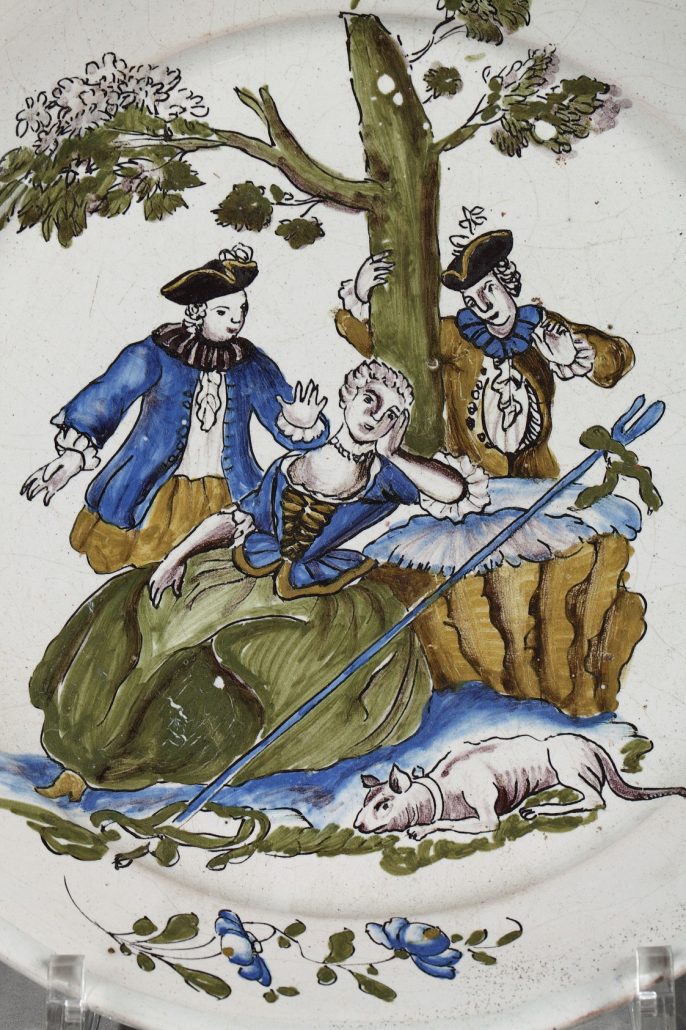 GERMANY : 18 th century. Tin-glazed earthenware plate depincting a love scene.