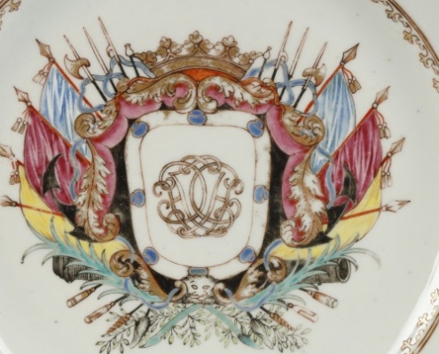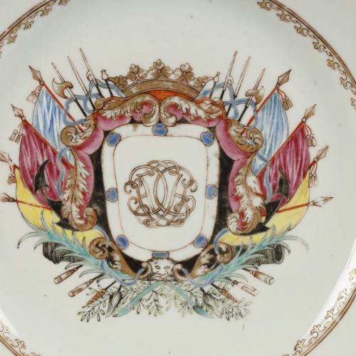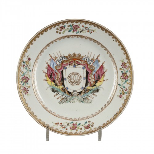 Belle assiette circulaire en porcelaine décorée en émaux de la famille rose de d’étendards de diverses couleurs, de trophées d’armes et fûts de canons encadrant un blason avec monogramme surmonté d’une couronne. L’aile à décor de fleurs et frises d’or.