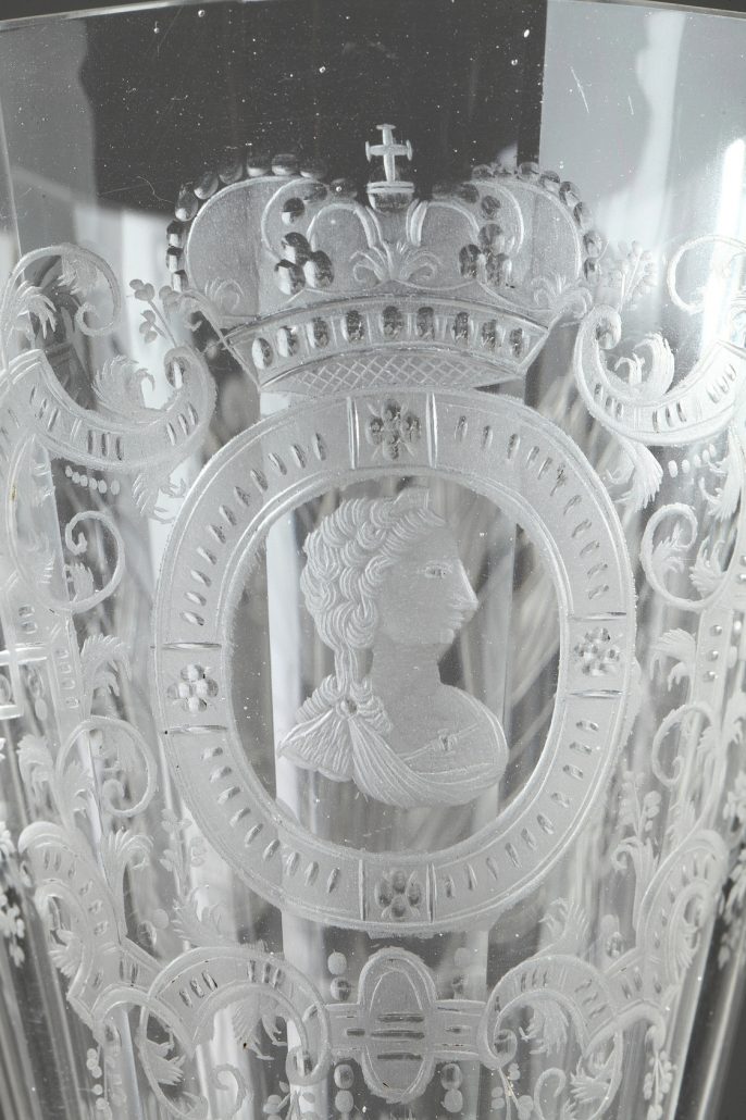 BOHEME. Grand verre facetté gravé sur une face du profil couronné de la reine de Hongrie et Bohême «Anna Regina» dans un encadrement de rinceaux fleuris, de guirlandes et de corbeilles. L’autre face représentant de drapeaux et des fûts de canons encadrant des tambours surmontés d’un heaume couronné avec trompes.