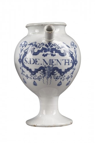 Chevrette d’apothicairerie en faïence reposant sur un piédouche à fond blanc, décoré en bleu sous couverte d’une inscription pharmaceutique “S.DE.MENTHA” (sirop de menthe) dans un cartouche formé de rinceaux avec deux oiseaux perchés, oeillets et motifs de passementerie encadrant une tête de diablotin.