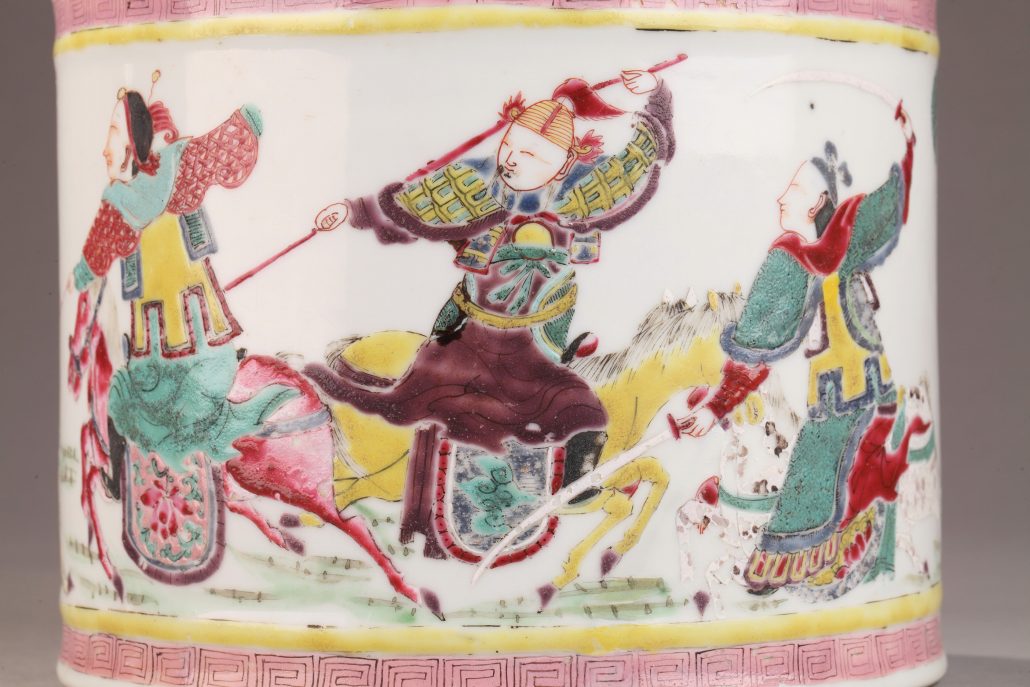 CHINE : Porte pinceaux de grande taille, cylindrique décor Famille Rose, de personnages.