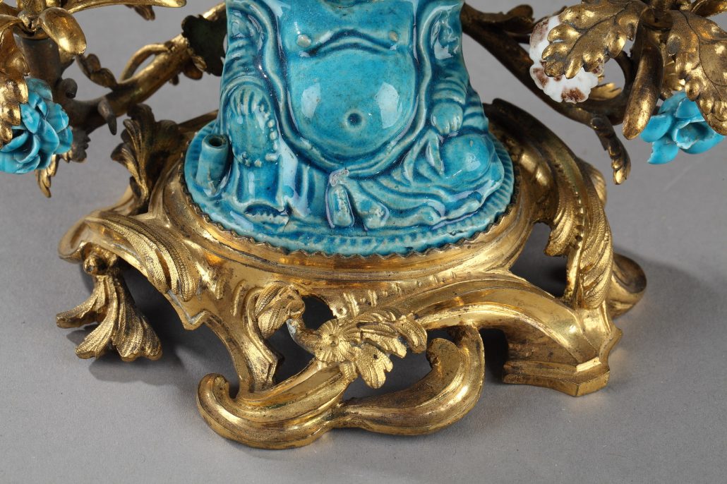 CHINE : Paire de figurines en biscuit turquoise représentant des bouddhas (putaï) assis. Ils ont été adaptés en France d’une monture rocaille en bronze ciselé et doré à la base d’où s’échappent un arbuste à fleurs en porcelaine de Meissen et deux branches faisant office de flambeaux.