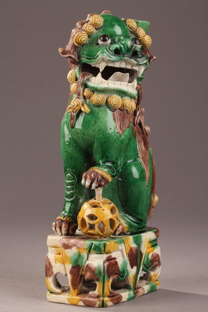 CHINE : Paire de chiens de Fô assis sur des bases rectangulaires, en biscuit décorés en émaux Sancaï ( trois couleurs, vert, ocre et manganèse ) dits “Arlequins”. Vases hexagonaux porte-batons d’encens sur leur dos. Le mâle pose une patte sur une balle de brocard ajourée, le chiot accroché à la patte de la femelle.