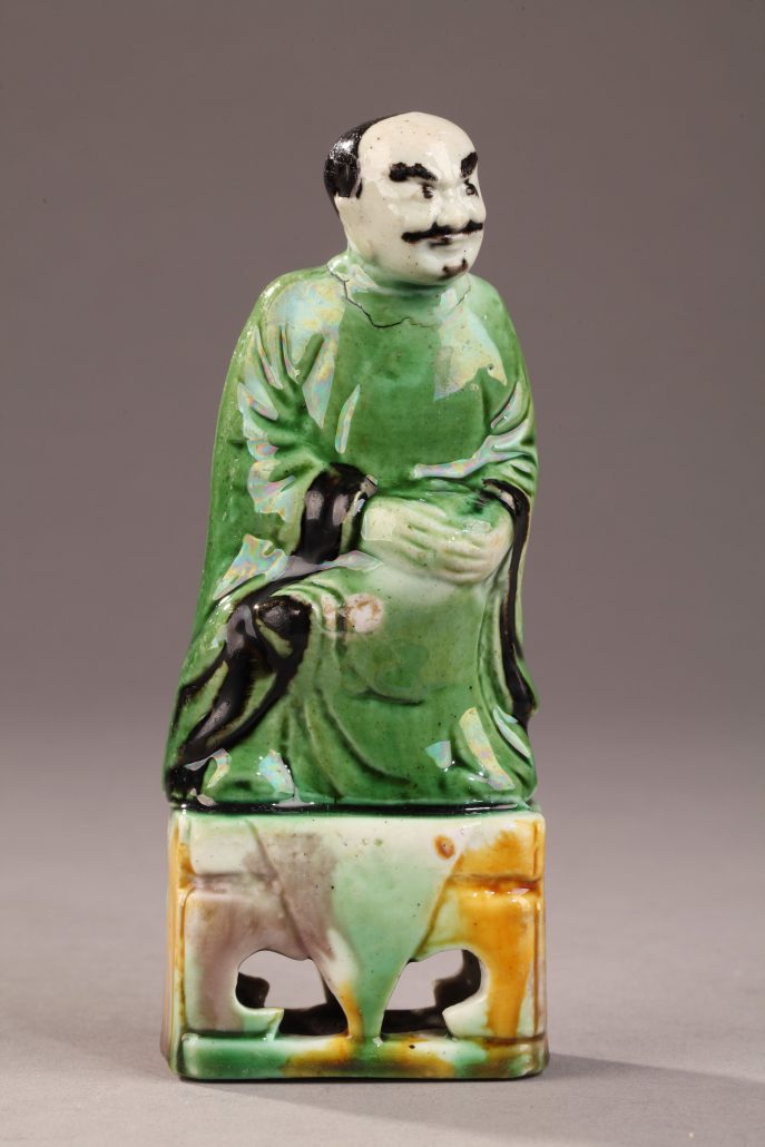 CHINE. Deux figurines en biscuit vert ocre et violet, représentant des lettrés assis. Le socle ajouré dans la partie basse dans le style Sancaï (Arlequin).
