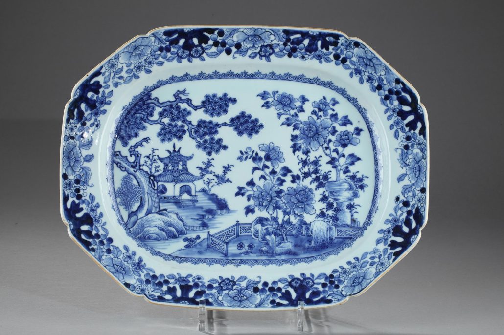 CHINE : Plat rectangulaire à pans coupés à décor en bleu sous couverte d’un jardin fleuri et d’un temple surmonté d’un pin. L’aile décorée de fleurs.