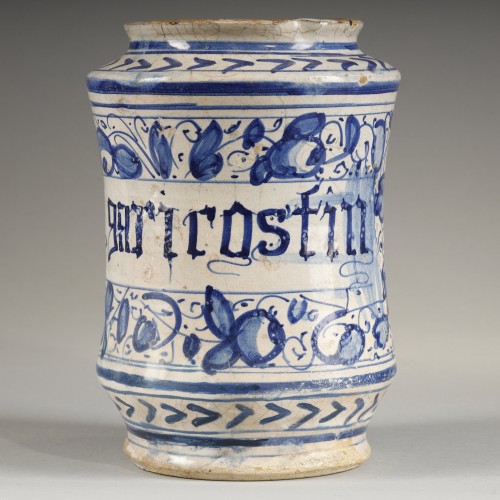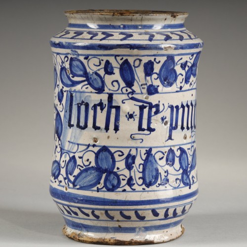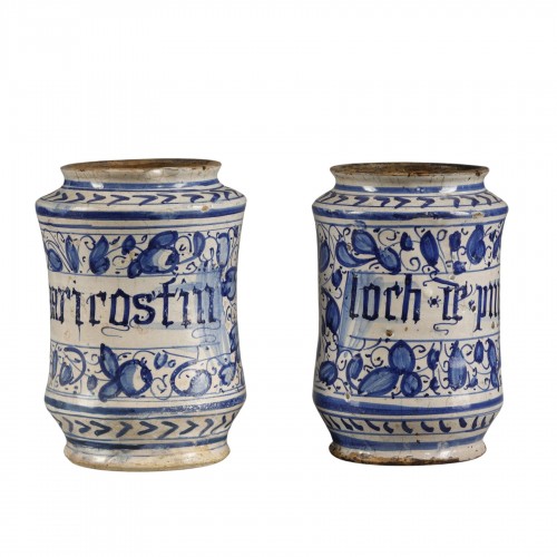 Deux larges Albarelli d’apothicaire en faïence de style gothico-floral décorés en bleu de feuilles stylisées encadrant des inscriptions pharmaceutiques en Latin dans des phylactères.