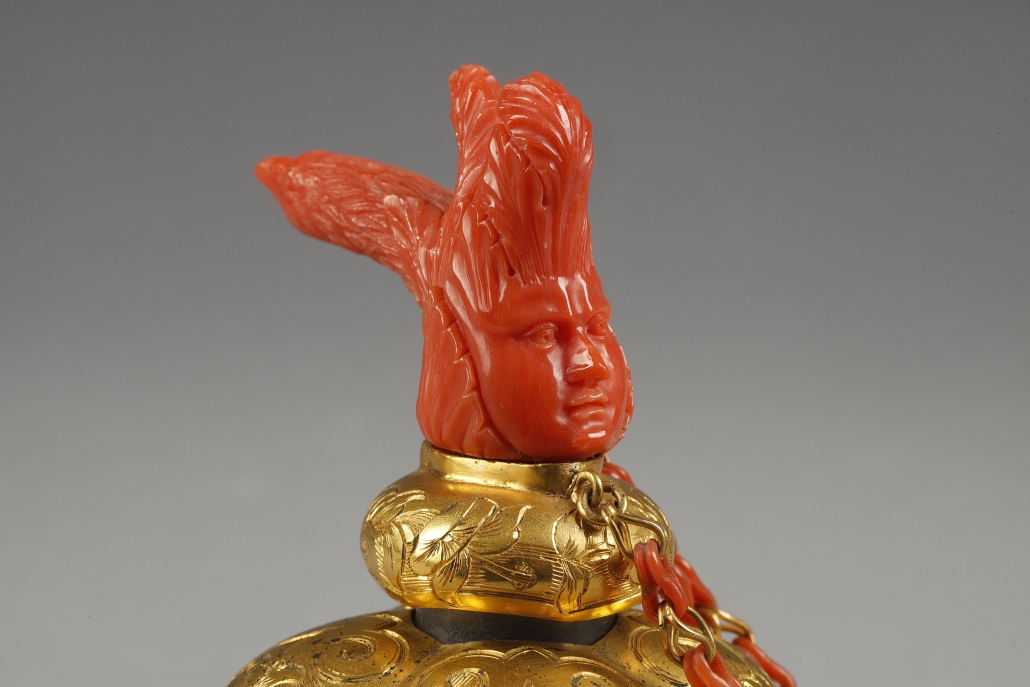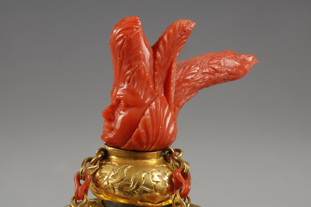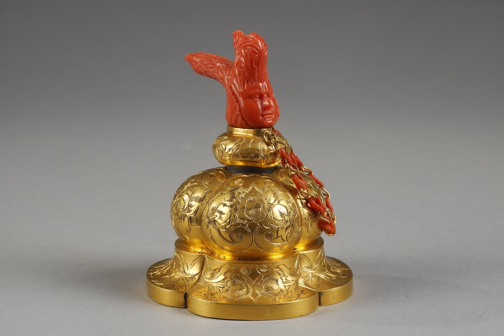 Encrier en bronze ciselé et doré de forme quadrilobé. Le couvercle surmonté d’une tête d’indien en corail sculpté dont le couvre-chef à plumes est terminé à l’arrière par une tête d’aigle. La chainette du couvercle à mailles en laiton alternées de corail. Le récipient à encre intérieur en verre.
