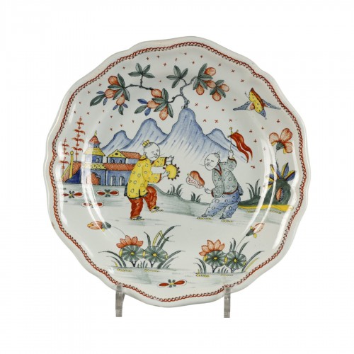Assiette en faïence décorée en plein en polychromie d’enfants Chinois, l’un jouant au tambourin, l’autre tenant un étendard et un éventail, sur fond de paysage oriental montagneux avec pagodes.