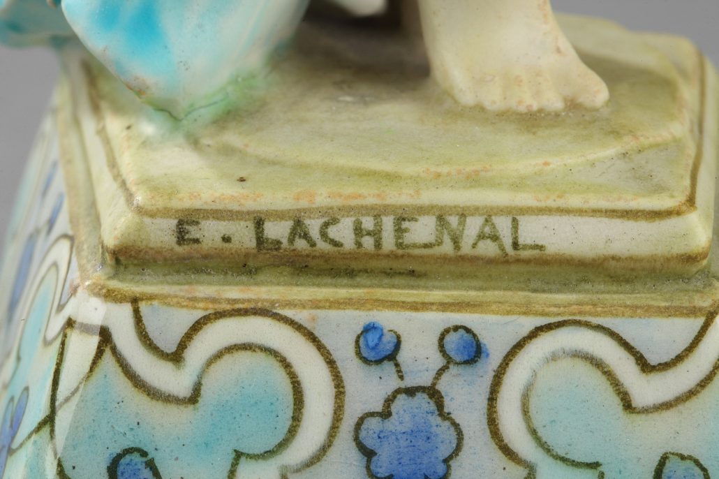 Edmond Lachenal 1855 – 1948, céramiste français, a étudié des l’age de 15 ans dans l’atelier de Thedore Deck. En 1889 à l’Exposition Universelle de Paris il reçut sa première médaille d’or pour ses faïences recouvertes d’émaux polychromes brillants. Il garda ce style toute sa vie. Il ne créa jamais d’émaux mats mais utilisait de l’acide Hydrufluoric sur ses vernis brillants.