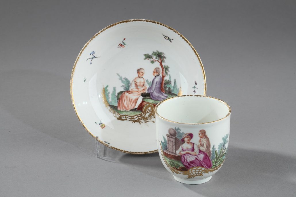 FRANKENTHAL : Paire de tasses et leurs soucoupes en porcelaine décorées en polychromie de scènes galantes dans des paysages ornés de motifs rocaille.