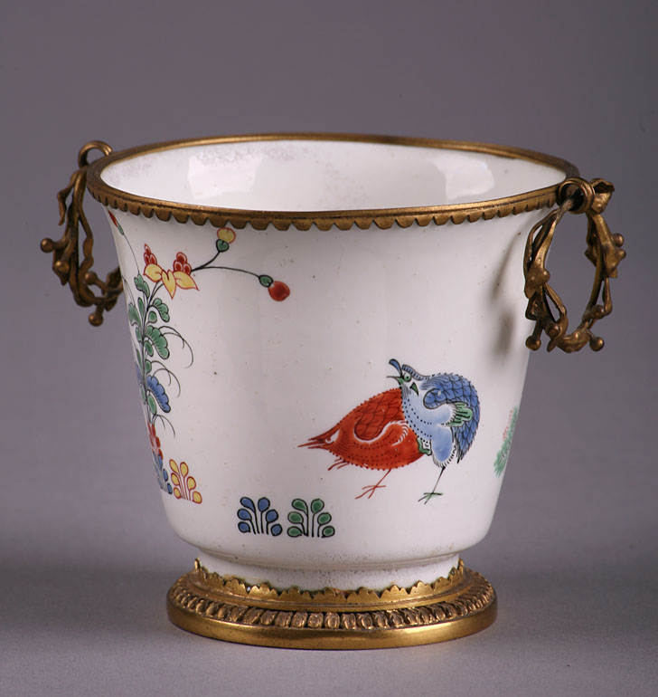 Gobelet évasé sur large piédouche en pâte tendre à décor polychrome Kakiemon de cailles et d’une branche fleurie. Marqué au revers du cor de chasse rouge. Il a été adapté d’une monture en laiton doré ornée de deux anses en forme de feuillages. Un des motifs les plus connus sur les porcelaines Kakiemon représente un ou deux petits oiseaux sur le sol entourés de plantes – millet, chrysanthèmes, ou prunus -. Ces oiseaux sont des cailles (en japonais «UZURA»). Symboliquement associées à l’automne, elles sont représentées quelque fois avec la lune dans le ciel. Il semble que ce motif a été créé au milieu du 17ème siècle ; il s’agirait d’une version simplifiée de productions de peintres de TOSA, qui fut l’école officielle artistique de la Cour Impériale à Kyoto. Au milieu du 17ème siècle, sous la direction de Tosa Mitsuoki on inclua dans cette production intitulée « oiseaux et fleurs peintes» des détails naturalistes dérivés des peintres de cour du 12ème siècle de la dynastie chinoise des Song. A Chantilly ces cailles ont été confondues et ont été dénommées «perdrix». Ce décor de cailles se retrouve également dans les manufactures de porcelaines européennes suivantes: Meissen, Bow, Chelsea, Worcester. On retrouve également ces motifs sur les faïences de Delft et de Rouen.