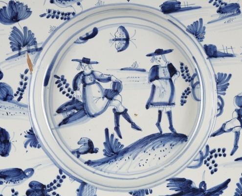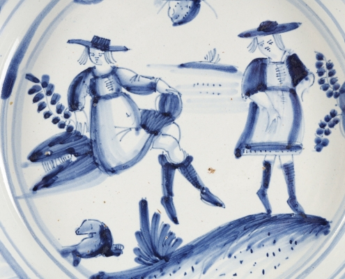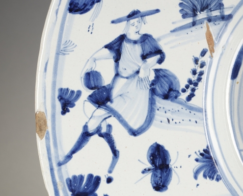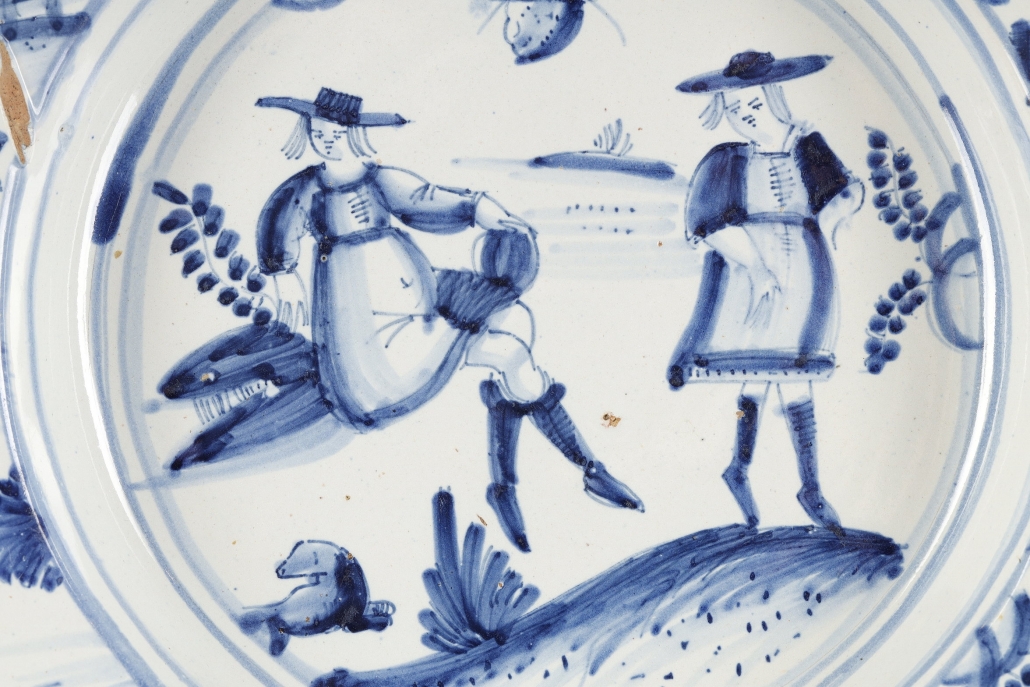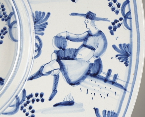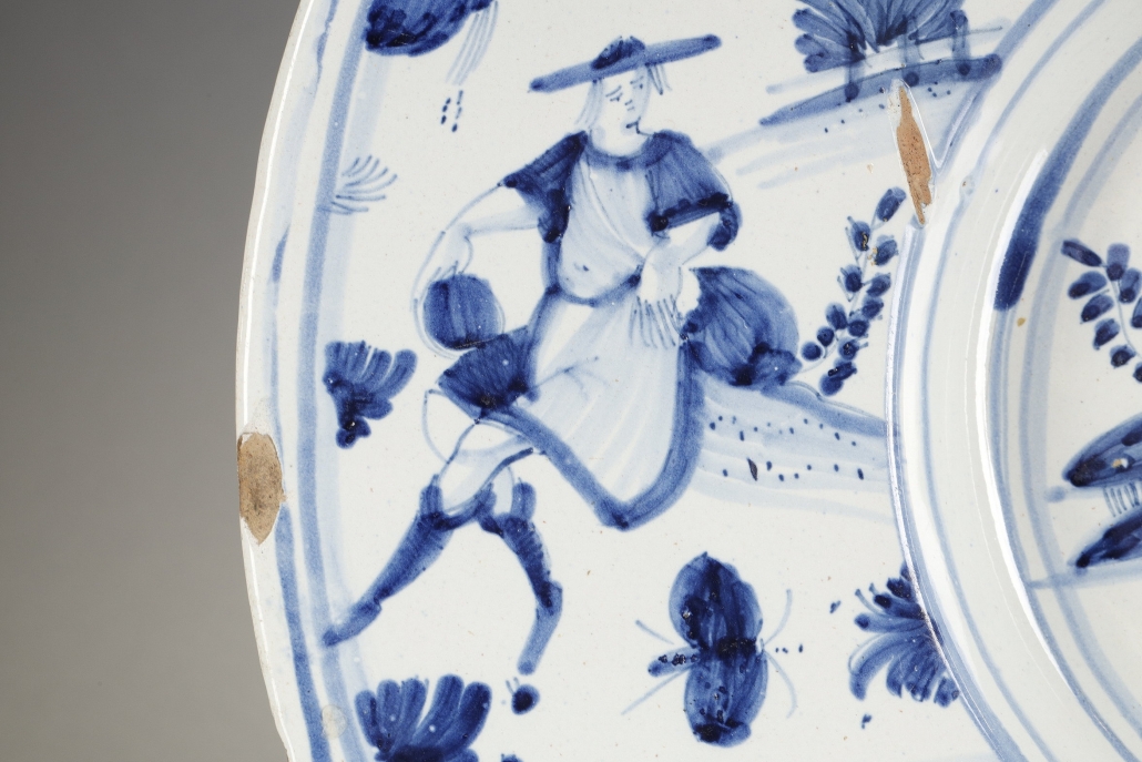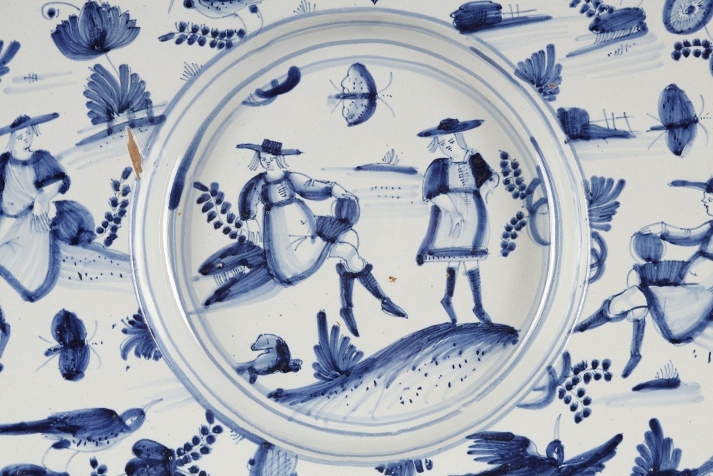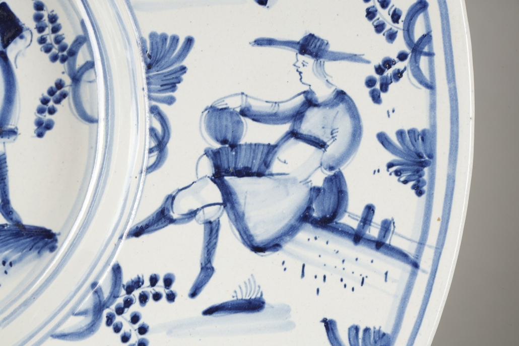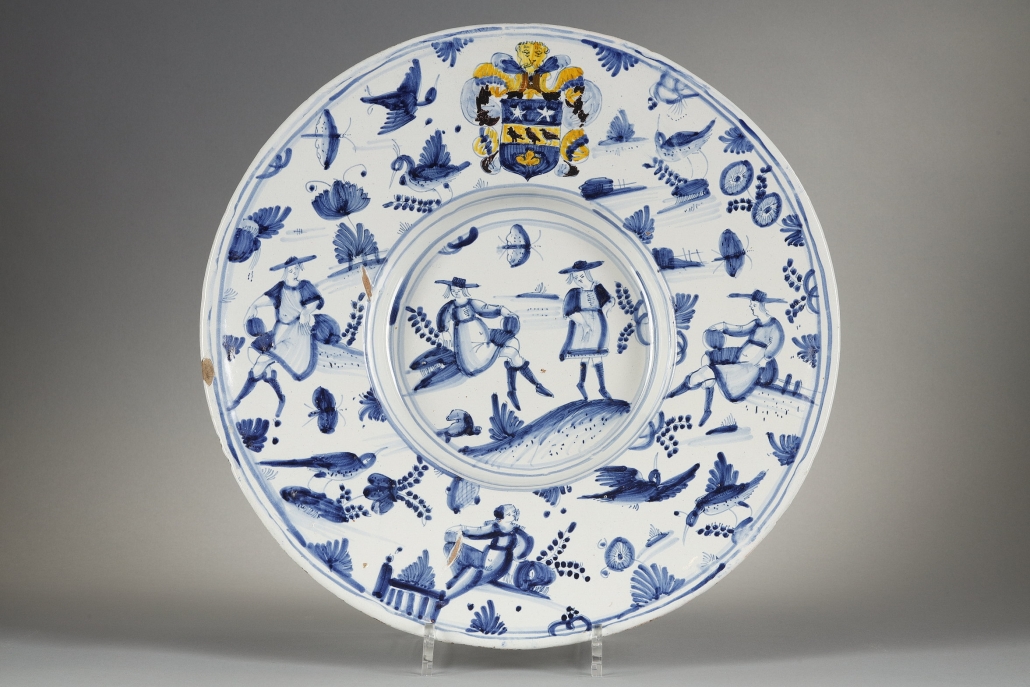 Grand plat à la cardinal en faïence décoré en bleu dans le style des Conrade de scènes issue du