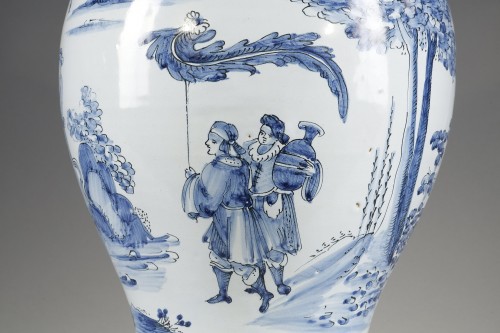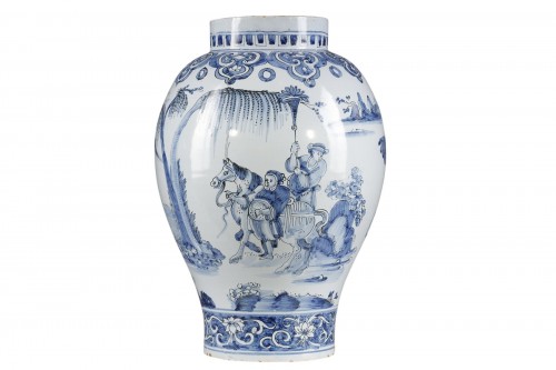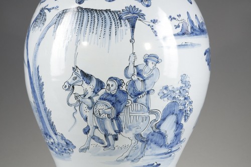 Grand vase de forme balustre en faïence décoré en bleu et traits noirs de trois scènes orientales dans des paysages, encadrées dans la partie haute par des lambrequins et en partie basse d’une frise avec fleurs stylisées.