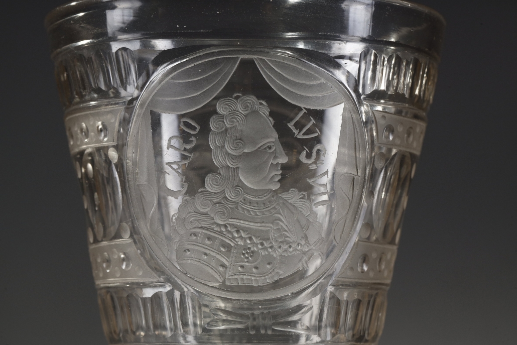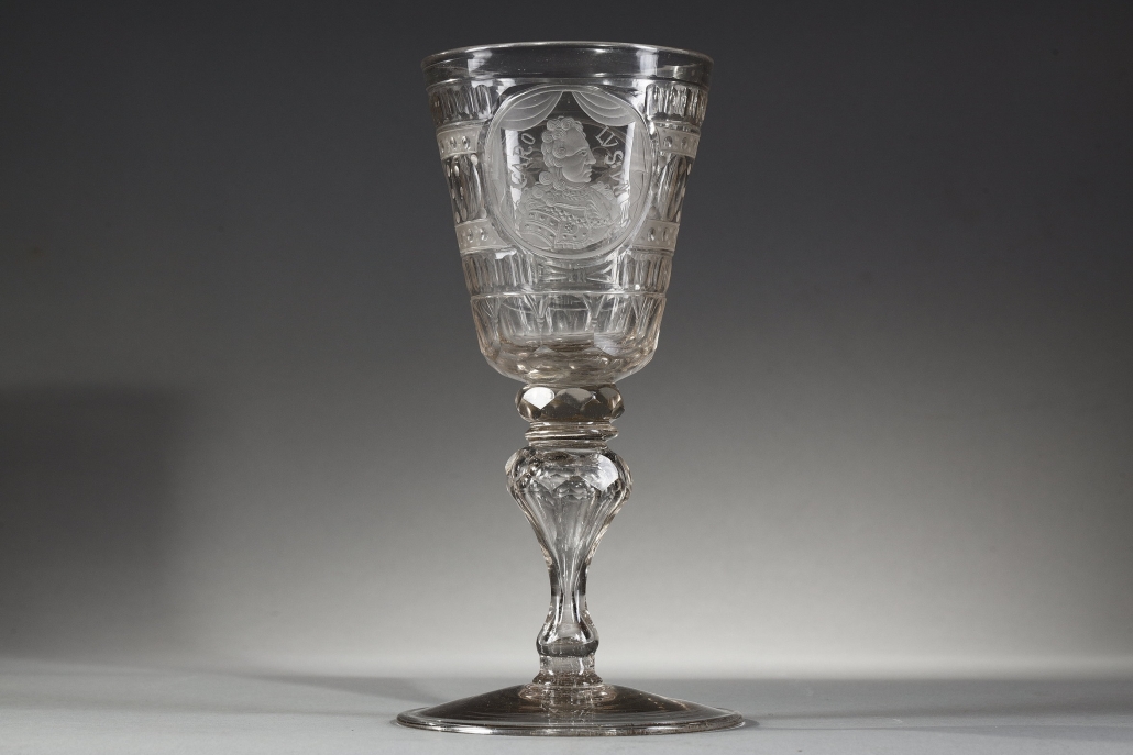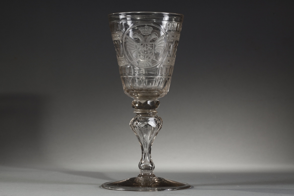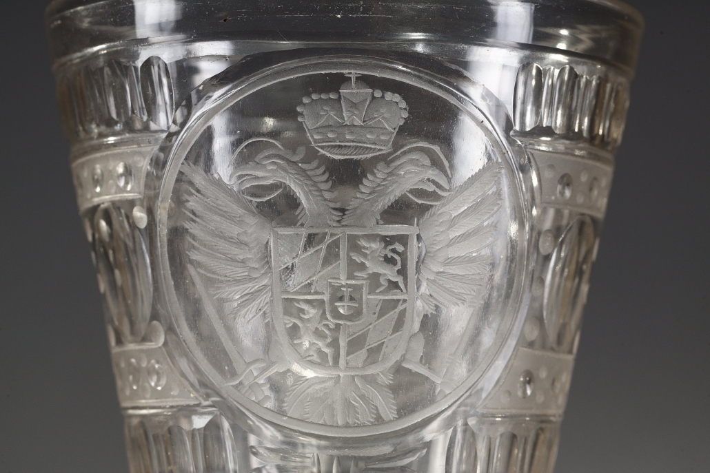 Exceptionnel très grand verre sur large pied gravé aux Armes et au portrait de Charles de Bavière ( 1697-1745 ) régnant sous le nom de Charles VII, Roi de Bohème en 1741, puis Empereur du Saint Empire Romain Germanique en 1742