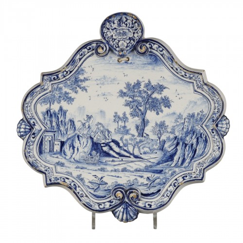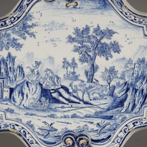 Grande plaque murale en faïence de forme rocaille, l’encadrement formé de rinceaux et de coquilles. Elle est décorée au centre en camaïeu bleu d’une scène galante représentant un couple s’offrant des fleurs, assis dans un paysage bucolique avec moutons, collines, château et ruines.