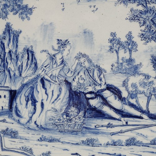 Grande plaque en faïence de Delft scène galante XVIIIe siècle