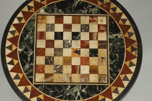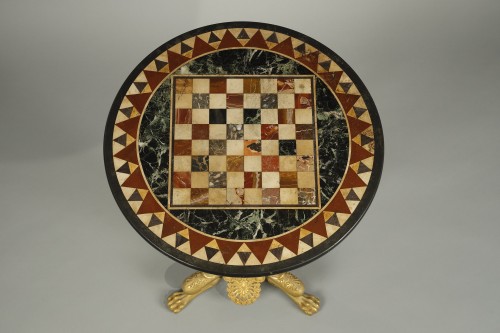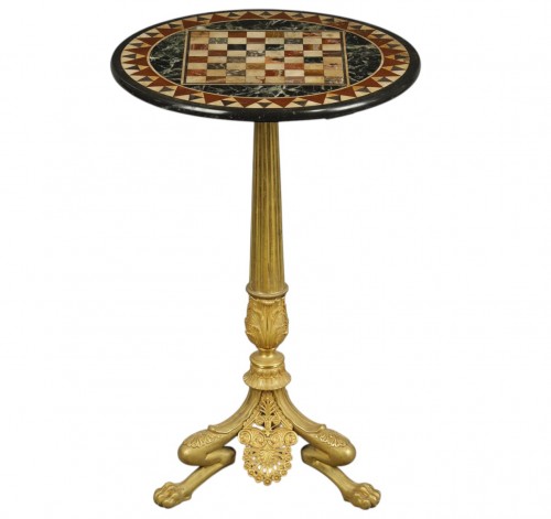 Guéridon tripode en bronze ciselé et doré, le plateau rond en échantillons de marbres formant en son centre un damier entouré d’une frise géométrique.