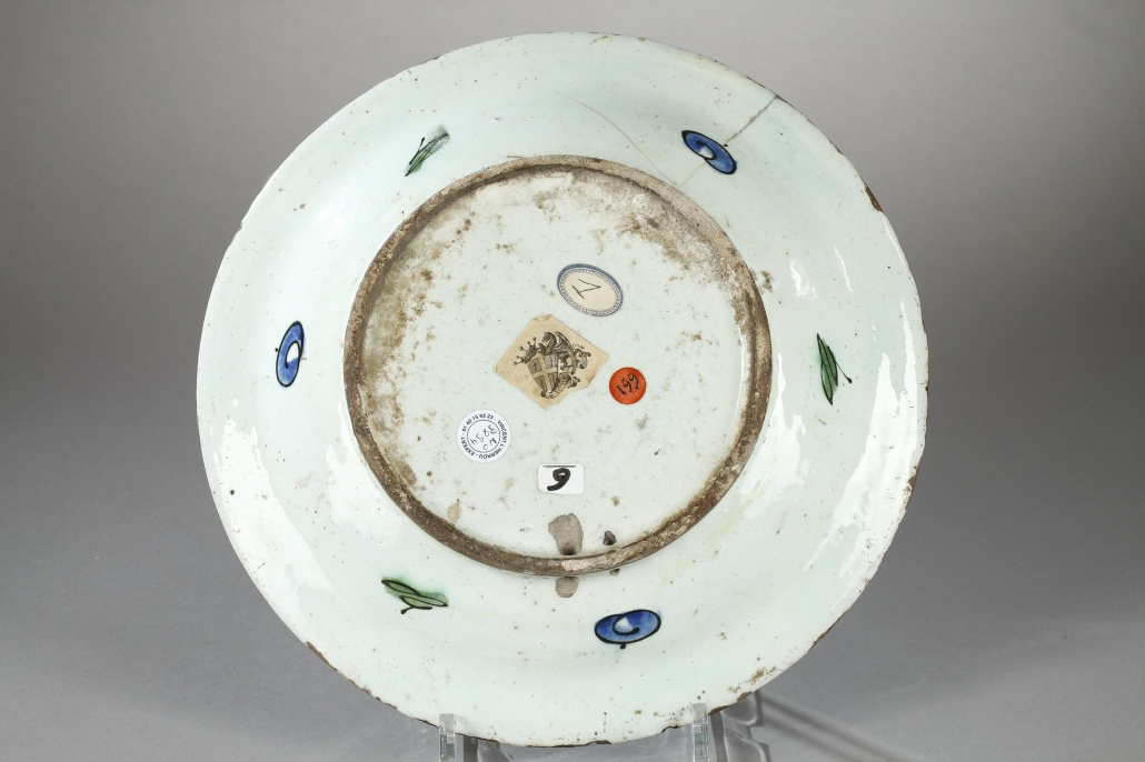 ISNIK (Anatolie,Turquie) : Plat circulaire en céramique siliceuse à décor peint en rouge et vert d’une branche de trois fleurs au centre encadrée sur l’aile d’une frise de feuilles et de fleurs stylisées en bleu, vert et rouge.
