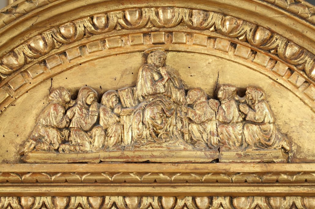 ITALIE Peinture sur marbre représentant l’annonciation dans son encadrement en marbres de couleurs blanc, rouge et noir décorées de rinceaux dorés. Le cadre en bois sculpté et doré richement décoré de motifs raphaélesques, surmonté d’un fronton arrondi à motif d’une scène biblique sculptée en léger relief.