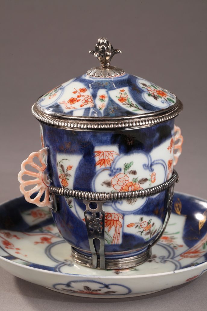 JAPON : Gobelet couvert et sa soucoupe en porcelaine de forme circulaire décorés dans la palette Imari de fleurs et de branchages dans des réserves, rares anses ajourées en forme de demi-roues ( symbolisant des mõns ) adaptés en France d’une monture en argent à godrons, le bouton du couvercle en forme de graine, le support de la trembleuse également en argent au poinçon de Paris de 1717 – 1722.
