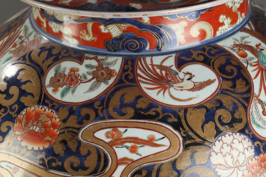 Le nom Imari donné à ce style de porcelaine vient du nom du port à quelques kilomètres d’Arita, d’où était exportée, principalement par les Hollandais, avec la V.O.C. (Verenigde Oost-Indishe Compagnie), la porcelaine fabriquée à Arita. La richesse du décor avec ses trois couleurs dominantes : le bleu de cobalt, le rouge de fer tirant sur le safran et le tout rehaussé d’or, sur fond blanc , était adaptée au goût de l’aristocratie Européenne de l’époque. Pour exemples grand nombre de ces pièces se trouvent encore dans les collections royales et princières de toute l’Europe.