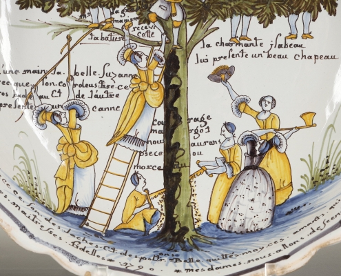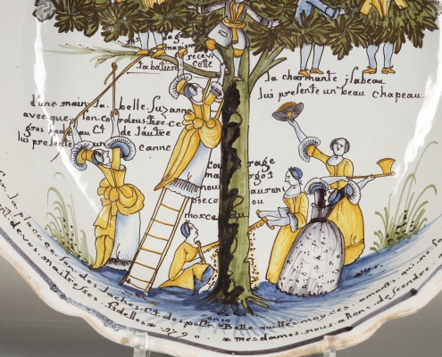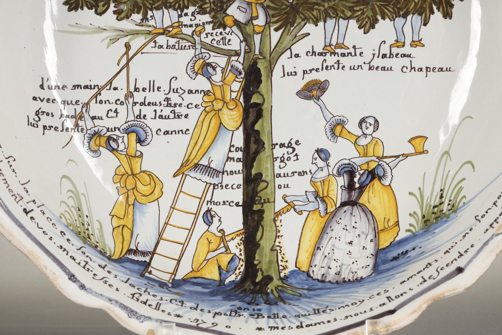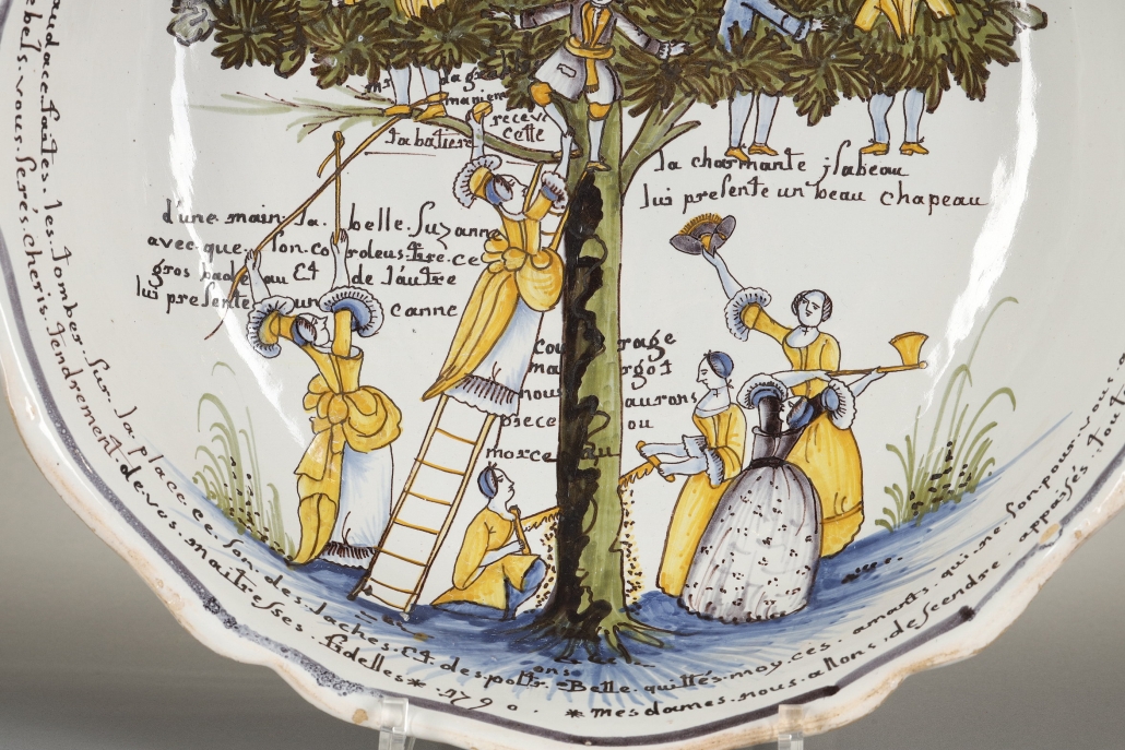 Jatte en faïence de Nevers à décor polychrome de l’arbre d’amour, datée 1790.