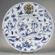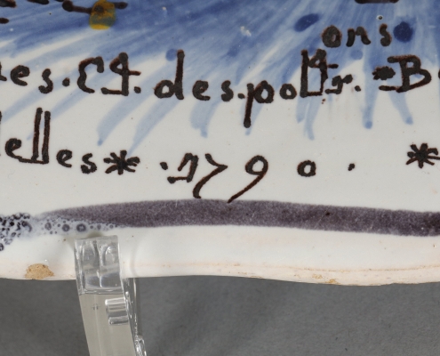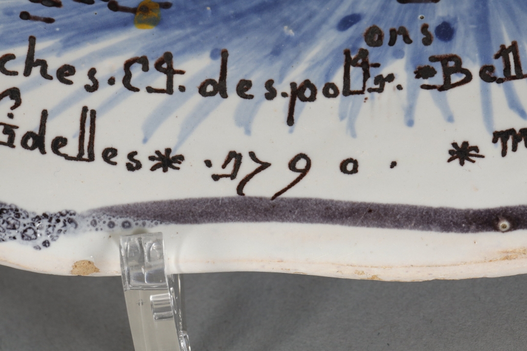Ce décor, d’inspiration populaire, est caractéristique des faïences de Nevers de la fin du XVIIIᵉ