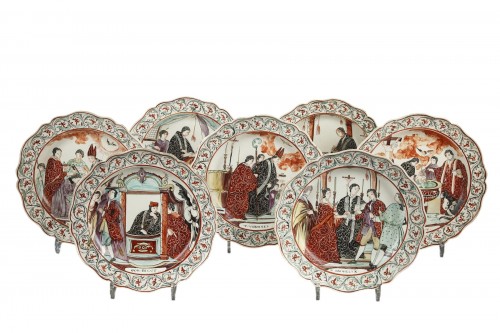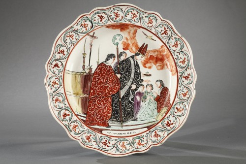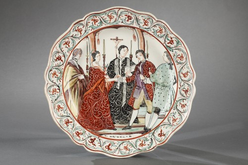 Rare suite de sept assiettes en faïence fine à bords contournés peinte en polychromie de scènes représentant les sept sacrements :