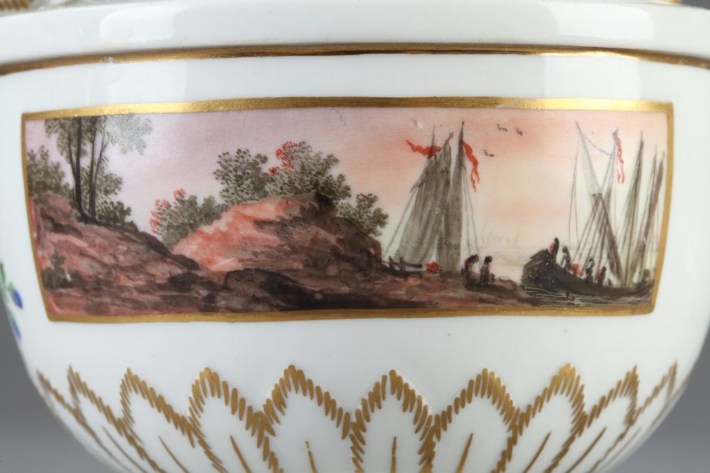 LUDWIGSBURG : Petite verseuse en porcelaine de forme balustre décorée en polychromie de scènes fluviales dans des cartouches, avec semis de bleuets, cannelures violines et filets or.