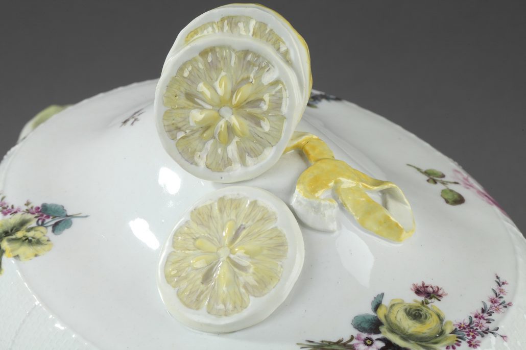 MEISSEN : Mid 18th century. Covered soup terrine and its tray, The finial in the shape of a lemon.