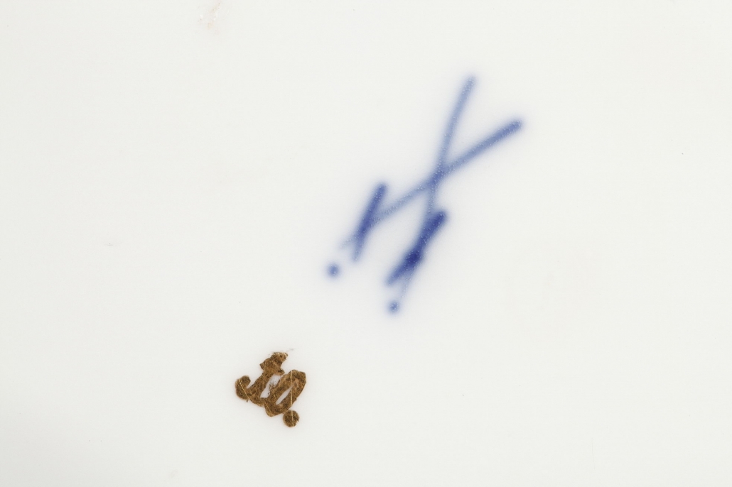 Marques aux épées croisées en bleu sous couverte et chiffre du doreur à l’or.