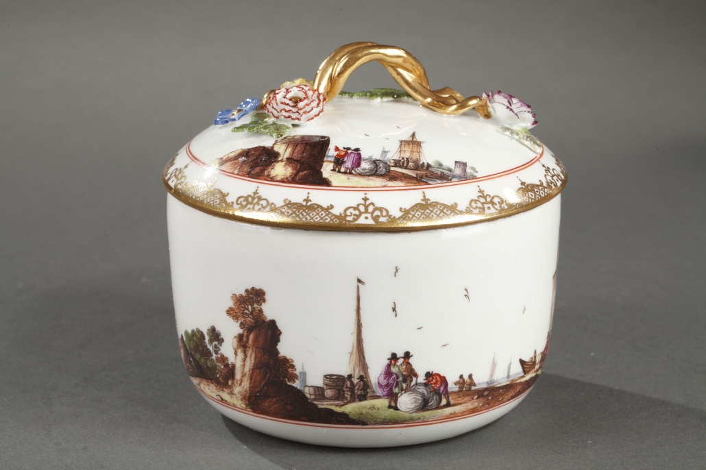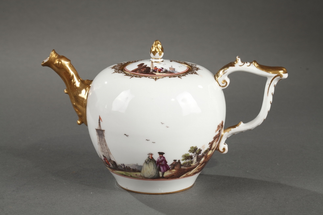 Exceptionnel grand service à thé et à café en porcelaine de Meissen circa 1740 décoré de scènes portuaires animées de personnages comprenant 7 pièces de forme et 18 tasses et leurs sous-tasses dont 12 tasses à thé et six grandes tasses à café.
