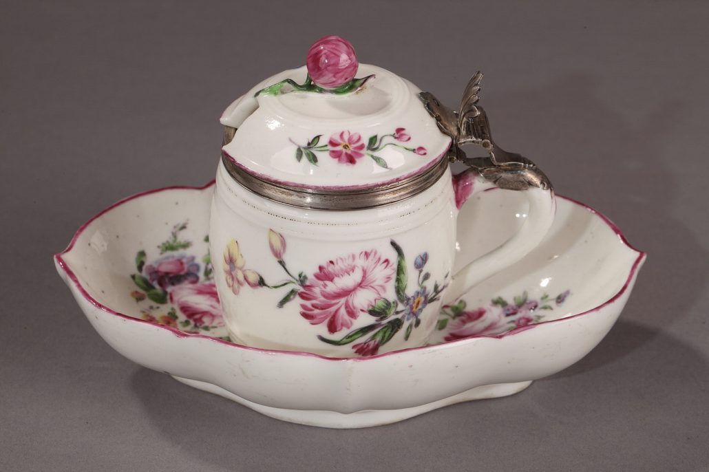 MENNECY : Moutardier et son présentoir en pâte tendre décoré en polychromie de fleurs : tulipe, myosotis, œillet sur fond blanc, la prise du couvercle en forme de pomme, monture du couvercle en argent.