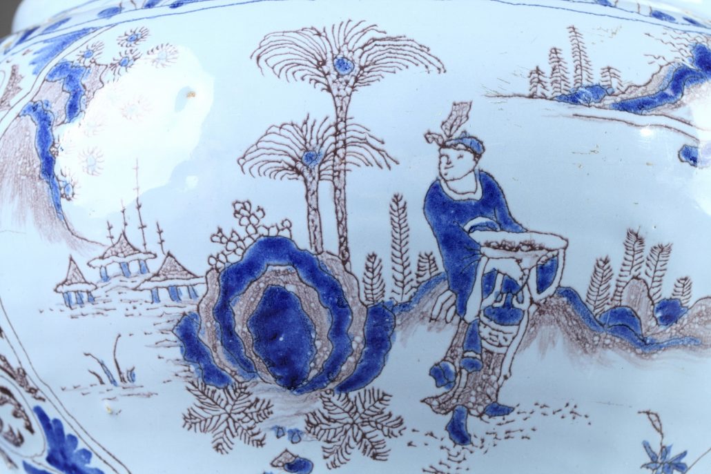 NEVERS. Grande jardinière pique fleurs en faïence à décor de scènes chinoises en bleu et manganèse, les anses à rare forme de cornes d’abondances.