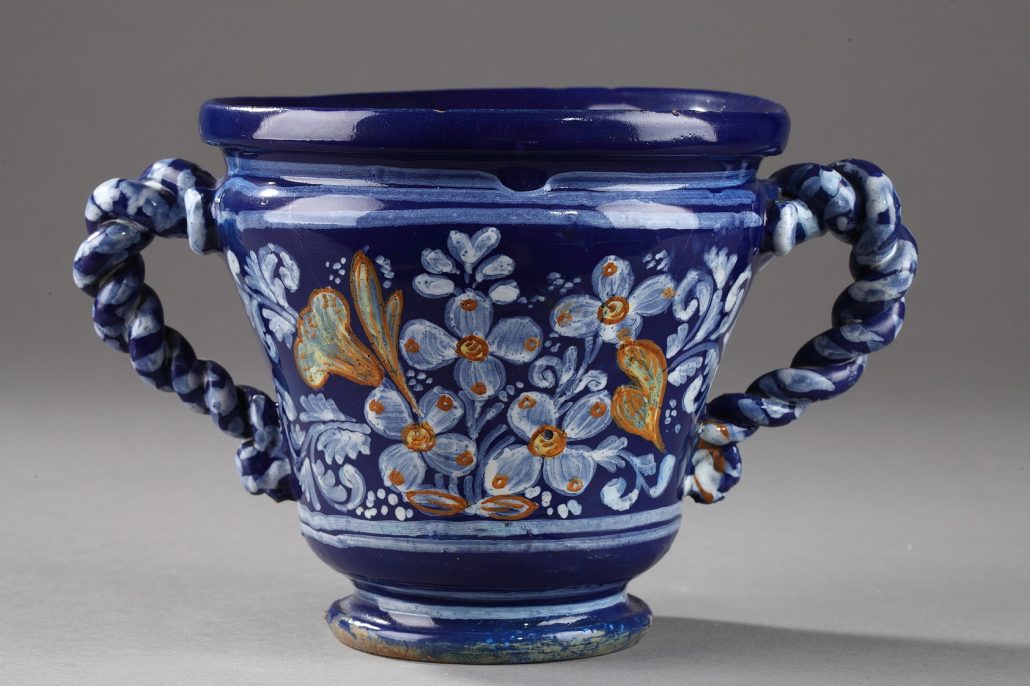 NEVERS Rare petit cache-pot en faience sur piédouche, à anses torsadées et à fond bleu persan décoré en blanc fixe et ocre jaune de fleurs et feuillages.