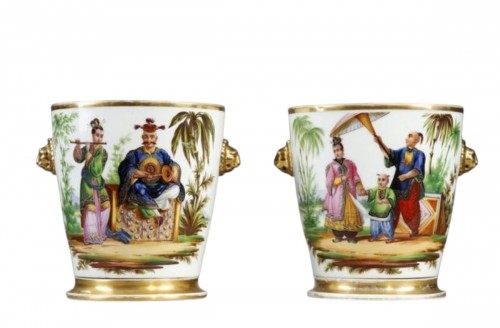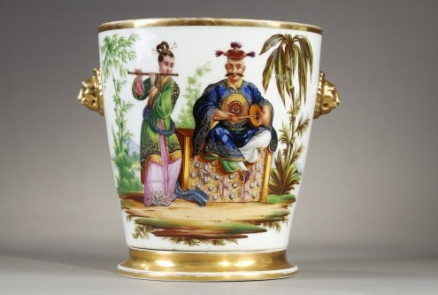 Cette paire de cache-pots à décors orientaux montre la constante fascination du monde occidental depuis le XVIIe siècle pour l’Orient, terre inconnue pour la plupart et donc, par essence, fantasmée. On le voit ici à travers les traits asiatiques des personnages, les riches vêtements ainsi que la végétation : tout rappelle un monde inconnu et invite au voyage.