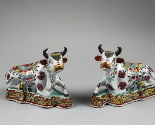 Paire de vaches en faïence de Delft décorées en petit feu 18e siècle