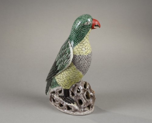 Figurine en biscuit émaillé représentant un perroquet perché sur un rocher ajouré de couleur manganèse, le plumage décoré en émaux de la famille verte.