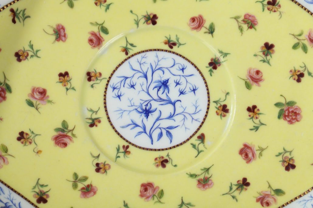 SEVRES. Ecuelle à bouillon circulaire, couverte et son plateau ovale, en pâte tendre, décor de roses et de pensées sur rare fond jaune, frise de fleurs bleues sur fond blanc en bordure.