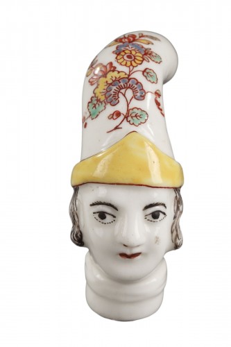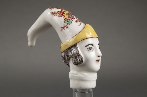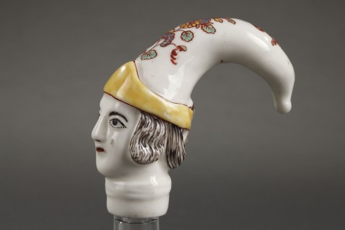 Rare pommeau de canne en porcelaine tendre de forme anthropomorphe. Il pourrait s’agir de l’amusant portrait de Louis Fournier, sculpteur de la manufacture avec son bonnet sur lequel figure un décor floral Kakiemon inspiré du Japon.