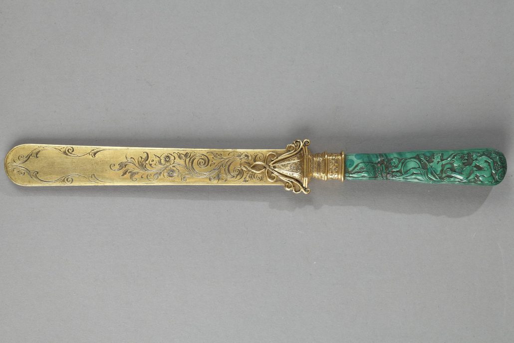 RUSSIE : Coupe-papiers à manche en Malachite sculptée décorée de scènes mythologiques de chaque côté ; la lame en bronze doré et ciselé richement décorée rinceaux et de fleurs, la garde ornée de rinceaux entremêlés.