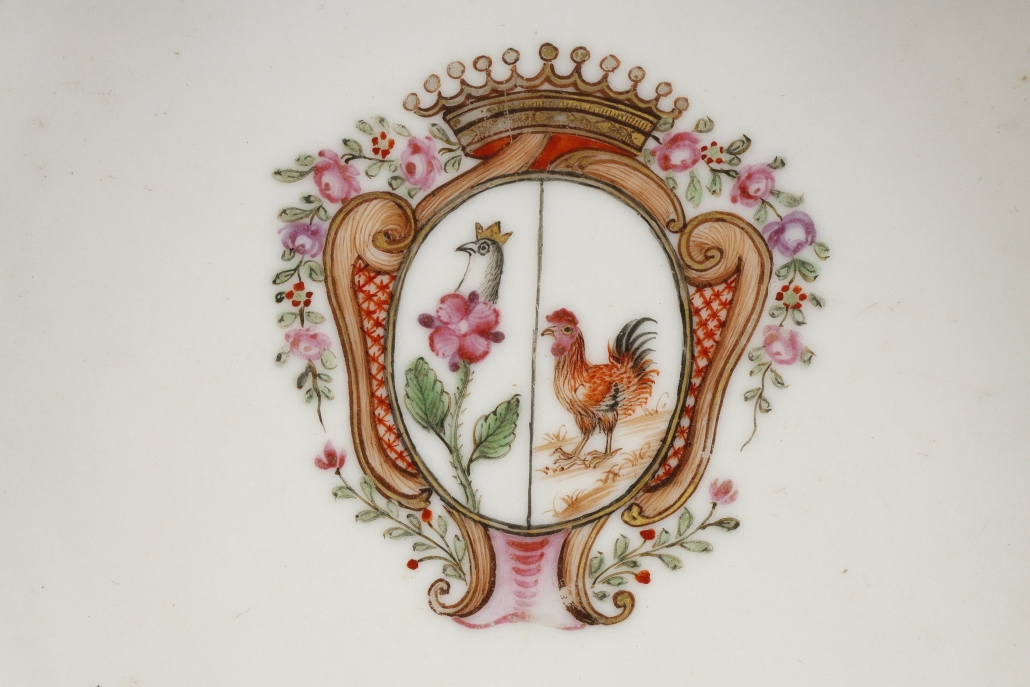 Tasse et sa sous-tasse en porcelaine décorées en émaux de la famille rose d’armoiries surmontées d’une couronne Comtale. Un des deux quartiers à décor de coq est proche de celui de la famille de Vogüé.