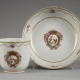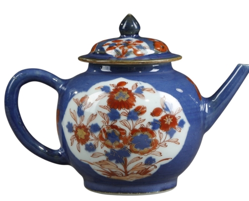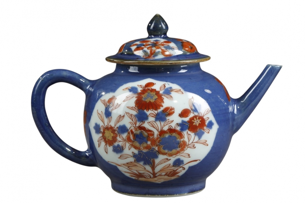 Théière couverte en porcelaine à fond bleu poudré, décorée dans des cartouches de fleurs et papillons en bleu et rouge dans la palette Imari.