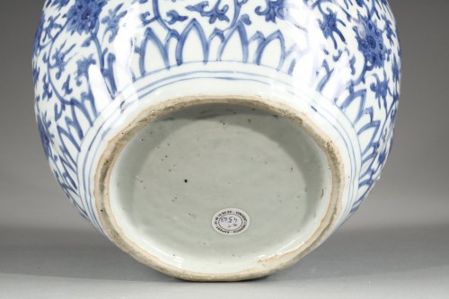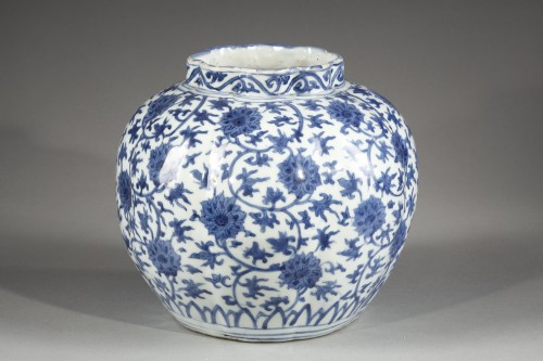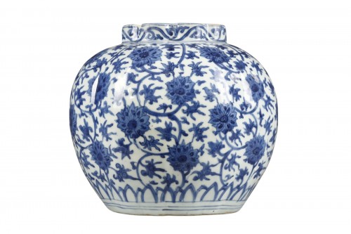 Vase en porcelaine à large panse de forme côtelée décoré en bleu sous couverte de fleurs de lotus traitées en enroulement.