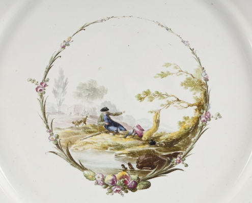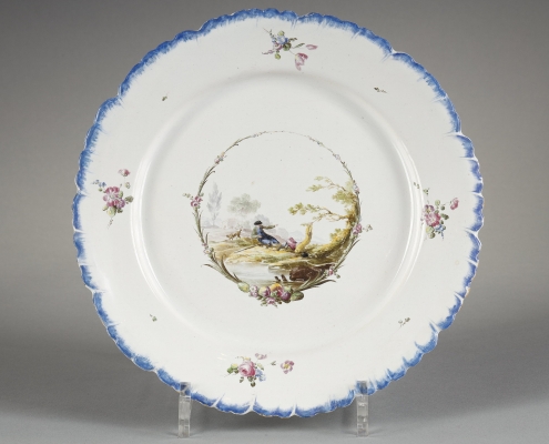 Assiette en faïence de Sceaux à bords déchiquetés et peignés bleu, décorée en petit feu d’un paysage central avec des personnages. décor attribué à Duvivier